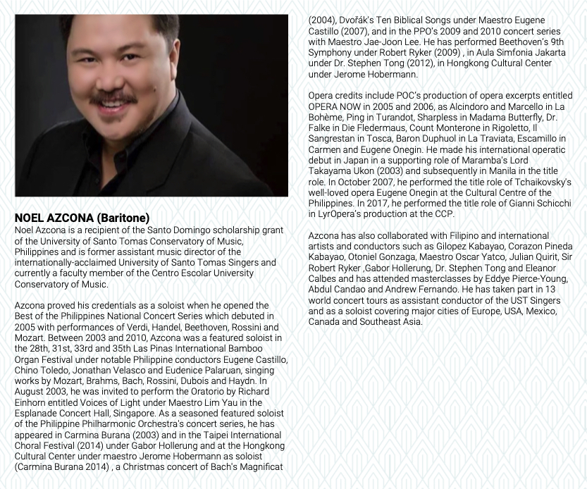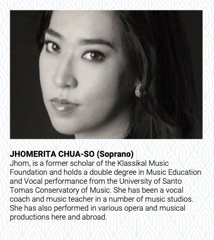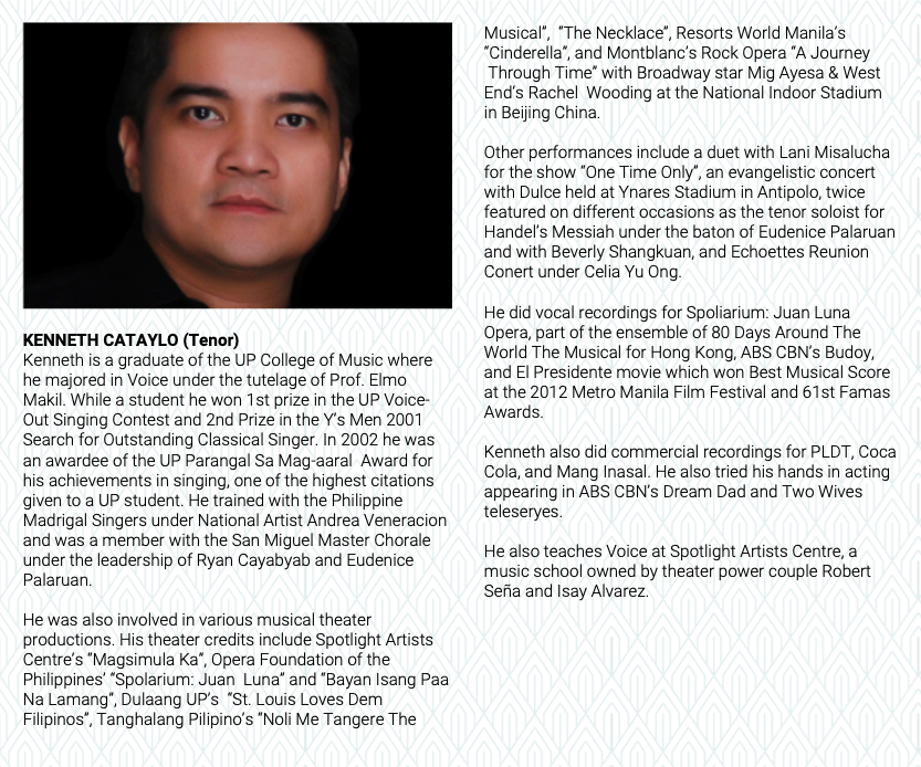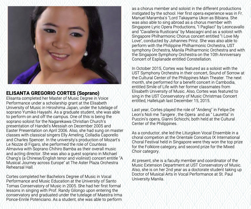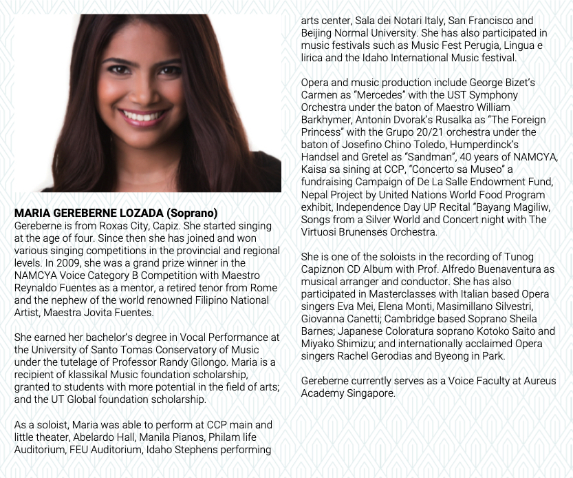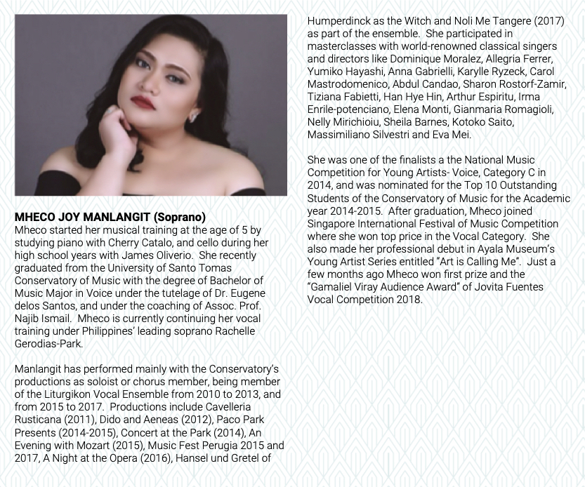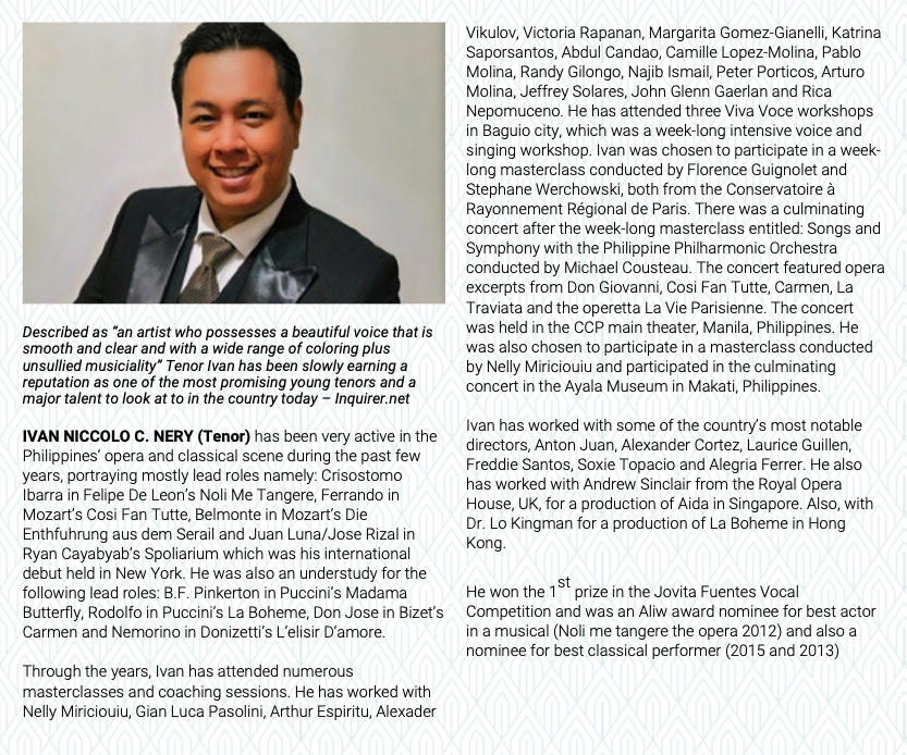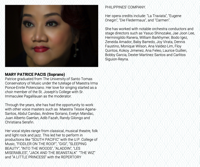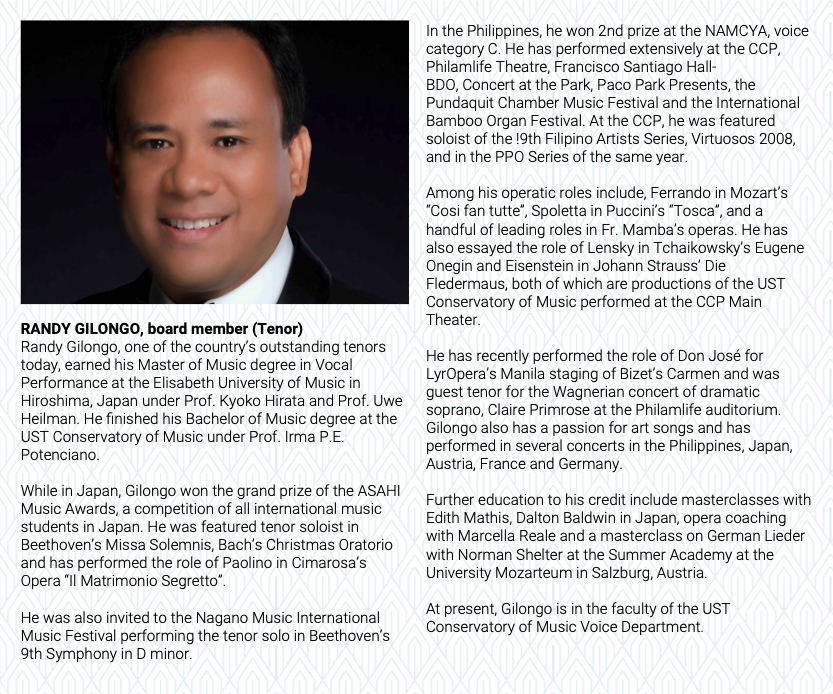 LyrOpera strives to champion the Filipino classical singer. We wish to revive the golden age of opera in the Philippines, and to recognize and emulate the contributions of local classical voice greats like Irma Ponce Enrile Potenciano, Conching Rosal, Armida Siguon-Reyna, Salvacion Yniguez, Mercedes Santiago, Sylvia La Torre, Fides Cuyugan-Asencio, Mamerto Villaba, Gamaliel Viray, Manny Gregorio, Aurelio Estanislao and other legends.