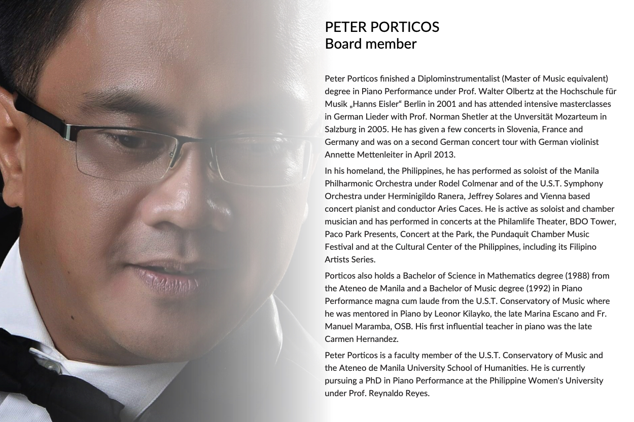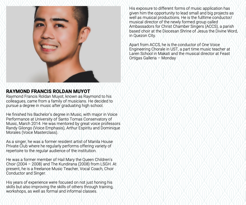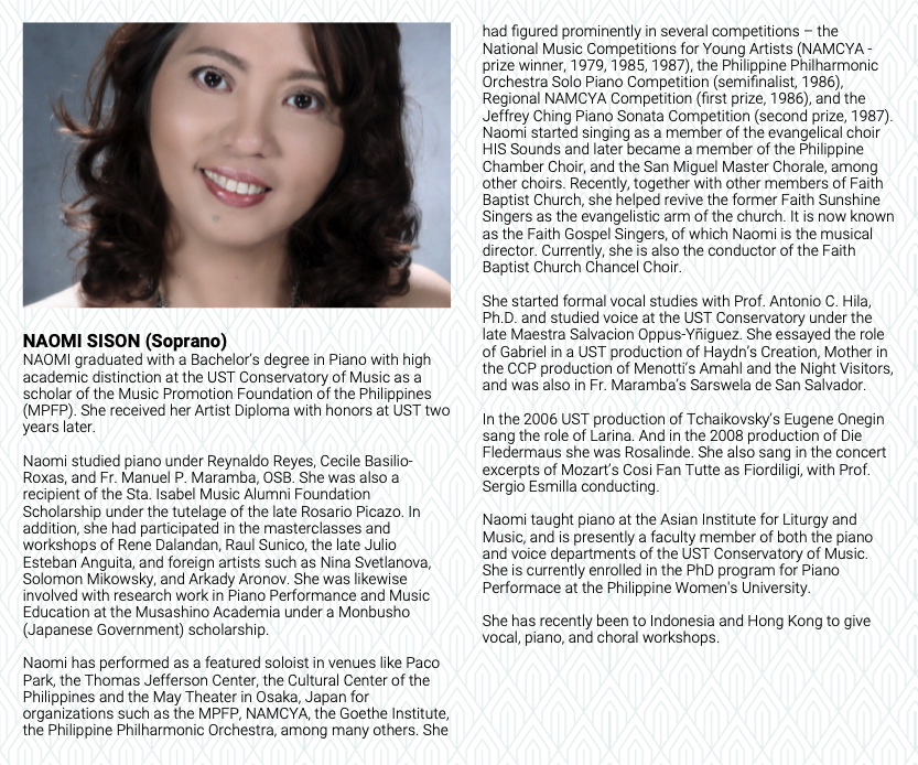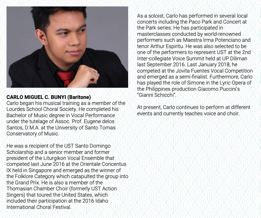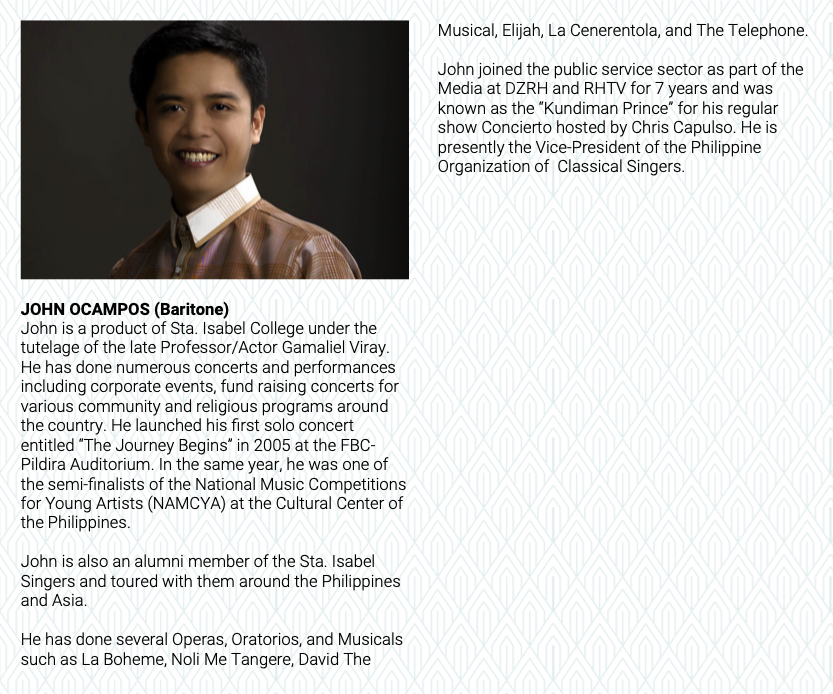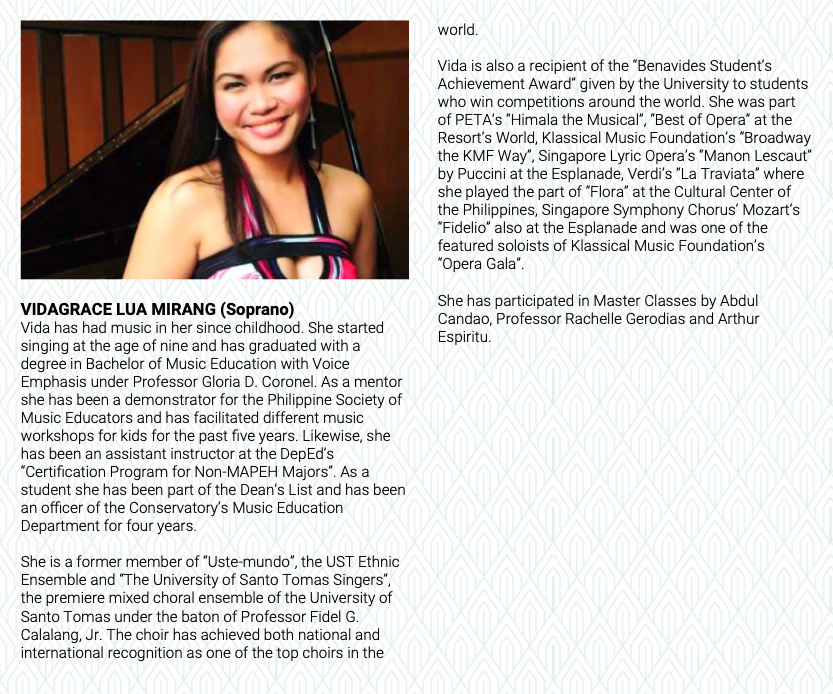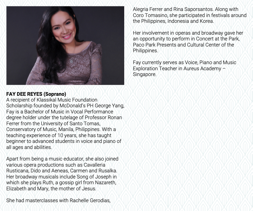 LyrOpera strives to champion the Filipino classical singer. We wish to revive the golden age of opera in the Philippines, and to recognize and emulate the contributions of local classical voice greats like Irma Ponce Enrile Potenciano, Conching Rosal, Armida Siguon-Reyna, Salvacion Yniguez, Mercedes Santiago, Sylvia La Torre, Fides Cuyugan-Asencio, Mamerto Villaba, Gamaliel Viray, Manny Gregorio, Aurelio Estanislao and other legends.