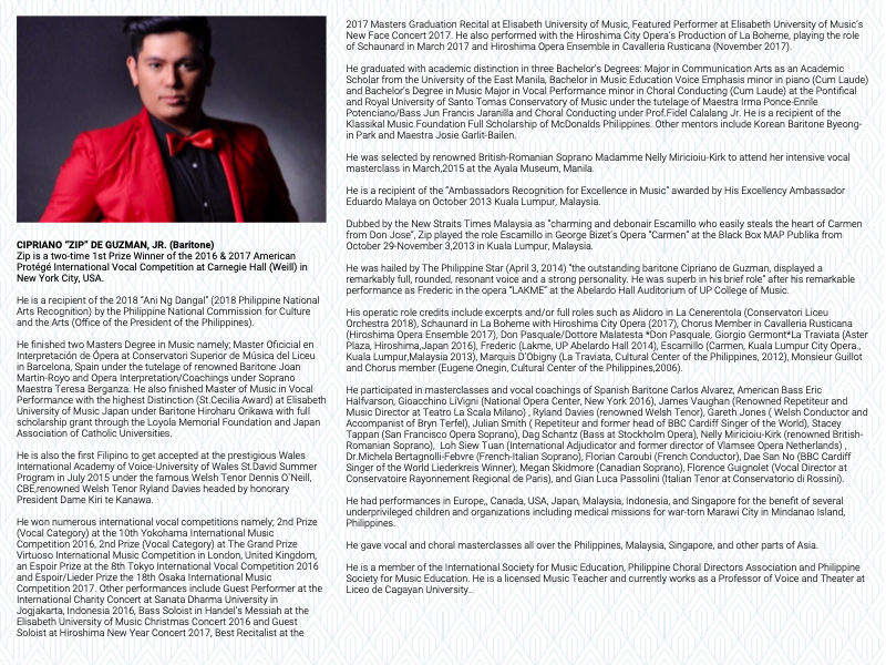 The first production of the fledgling opera company was a pan-Asian concert which gathered together singers from 6 Asian cities. The 6 cities include: Shanghai, Hong Kong, Kuala Lumpur, Taipei, Baguio and Metro Manila. Conducting the Manila Symphony Orchestra was Maestro Arturo Molina.
