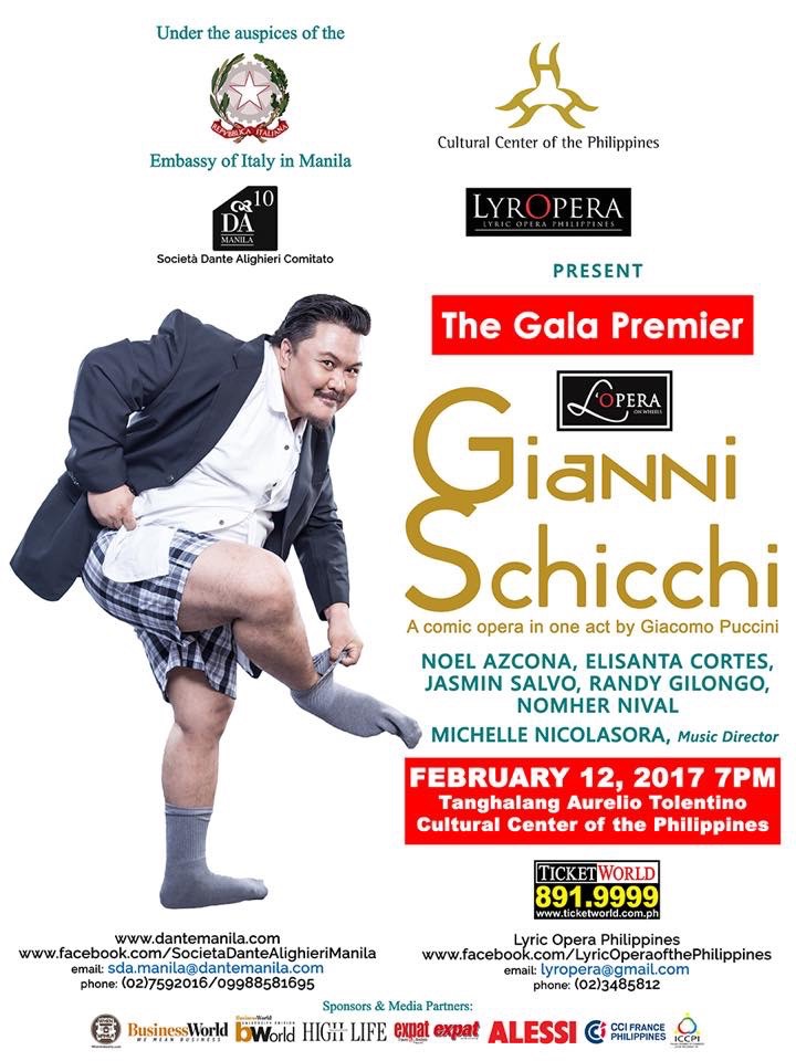 In 2016 LyrOpera launched “Opera on Wheels” or “L’Opera on Wheels”. This project chooses short or shortened versions of famous operas and stages them in a compact and easily toured way. The idea is to bring operas to where the people are. The shows can be staged in large theaters, small concert halls, or even someone’s living room. The first opera staged in this format is Puccini’s Gianni Schicchi. The Gala Premier was shown in Tanghalan Aurelio Tolentino at the CCP. Regular run at the Spotlight theater in Ayala’s Circuit Makati. Directed by LyrOpera co-founder Sherwin Sozon.