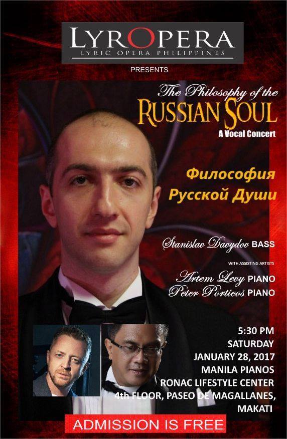 A recital of Russian arias and art songs sung by visiting Russian Bass Stanislav Davidov, Russian pianist Artem Levi and pianist Peter Porticos.